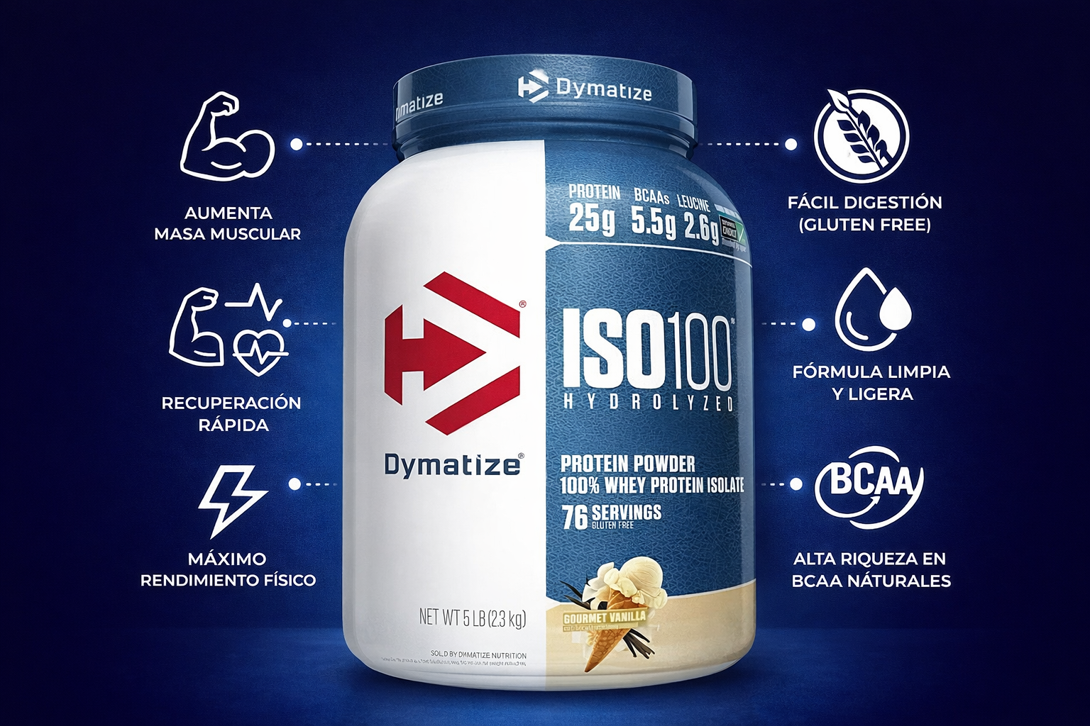 Su presentación de 5 lb (2.3 kg) con 76 porciones la convierte en una excelente opción para quienes buscan rendimiento constante, volumen muscular y una suplementación de larga duración.